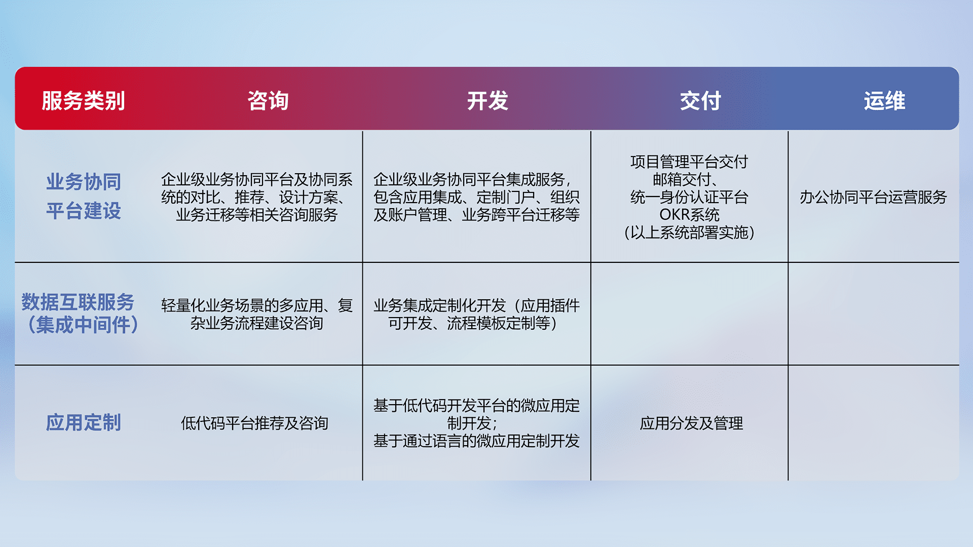 针对钉钉、、、企微、、、、IDaas等平台级产品提供产品的规划、、、、方案、、交付、、、、定制化开发等服务,,,,实现如统一协同办公、、智能客户服务、、混合会议管理、、、、智能数据查询、、、等业务场景,,,,实现数字化转型。。。