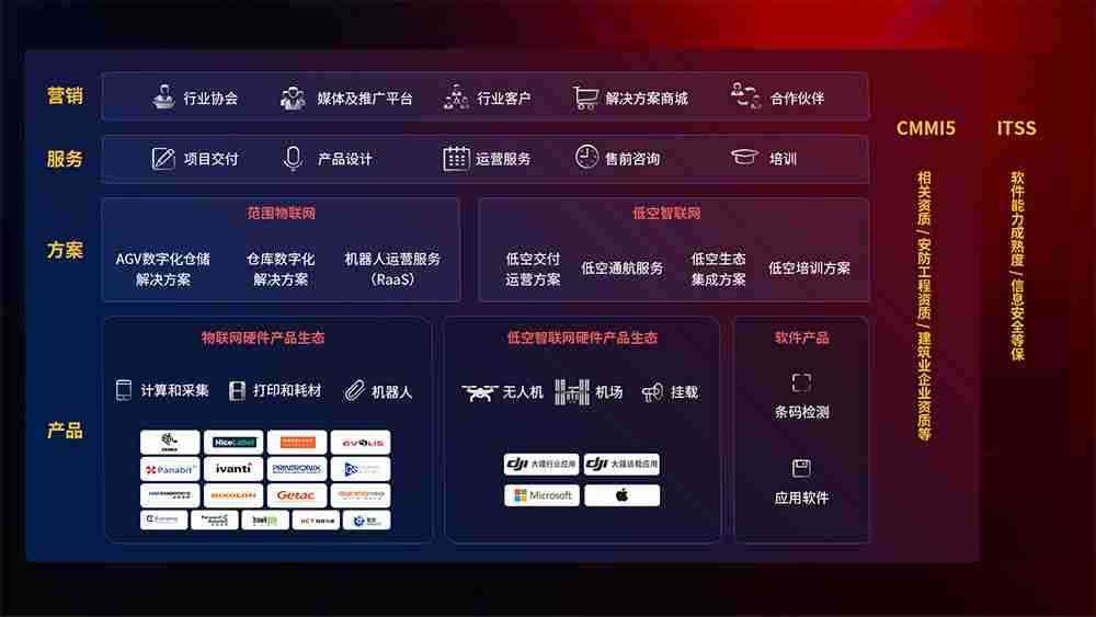 聚合国内外先进的物联网硬件产品品牌,,聚焦数字化仓储、、机器人运营、、、、低空智联网等领域,,共同打造适合客户业务场景的解决方案并提供交付服务